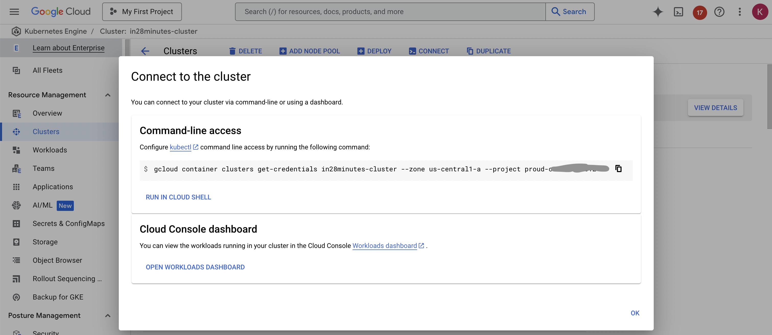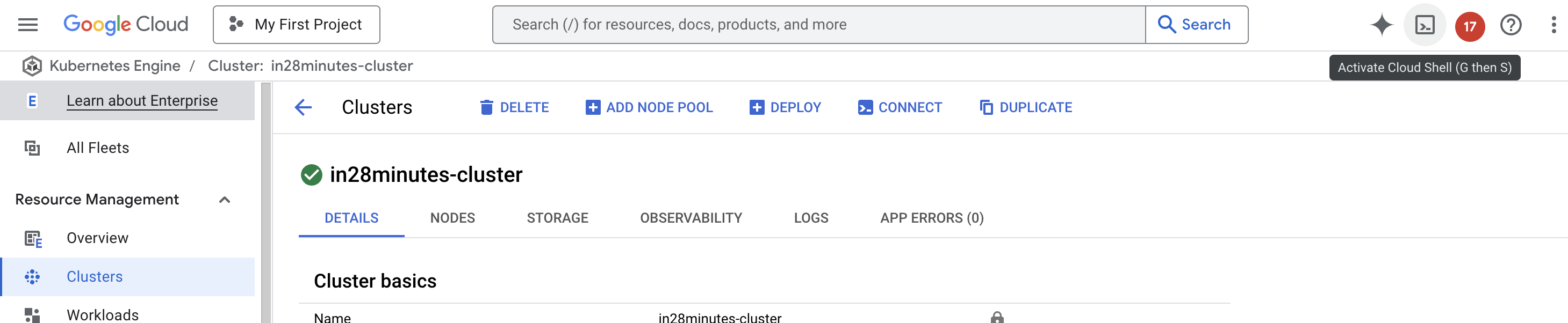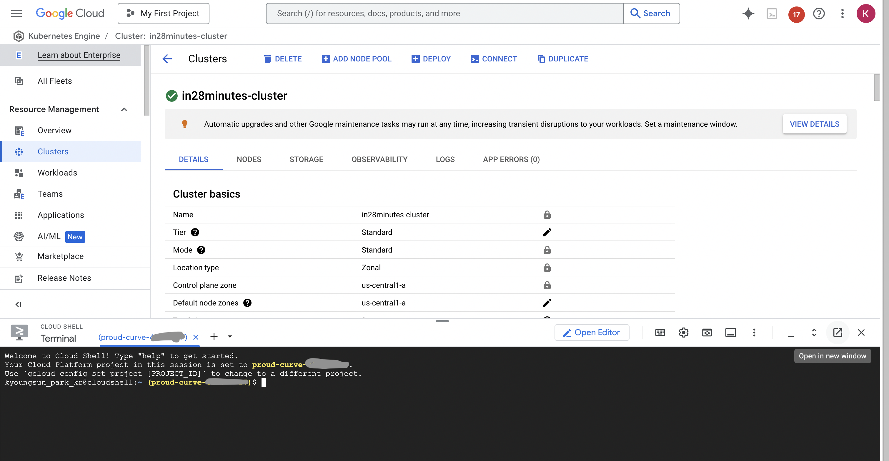 1. 클라우드 쉘을 통해 구글 쿠버네티스 클러스터에 연결한다. Clusters 메뉴에서 클러스터 이름을 클릭하고 들어가서, 오른쪽 상단의 Activate Cloud Shell을 클릭하면 하단에 클라우드 쉘이 뜬다. 처음 activate할 때는 약간의 로딩 시간이 걸린다.