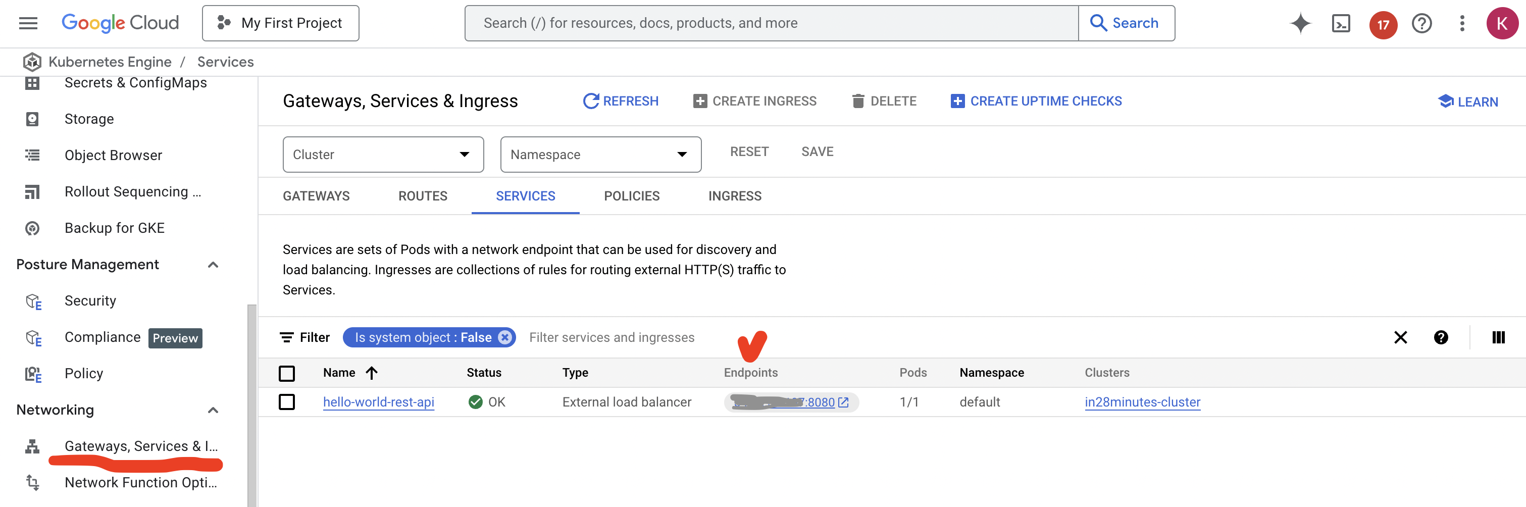 7. 이제 이 서비스를 browser를 통해 확인할 수 있다. 외부 접속을 위한 정보를 확인하기 위해 Networking > Gateways, Services & Ingress 메뉴를 클릭한 후 오른쪽 페이지에서 SERVICES 탭을 클릭하면 서비스 리스트를 확인할 수 있다. Endpoints에 있는 URL로 배포한 애플리케이션에 접근할 수 있다.