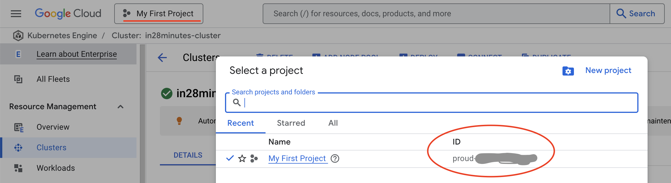 project id는 Google Cloud 오른쪽에 있는 프로젝트 이름을 클릭하면 뜨는 프로젝트 리스트 팝업창에서 확인할 수 있다.