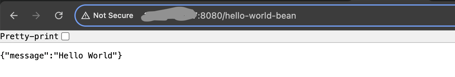 8. 7번 단계에서 확인한 {Endpoint}/hello-world-bean 주소를 browser에서 실행하면 간단한 hello world 메시지를 확인할 수 있다.